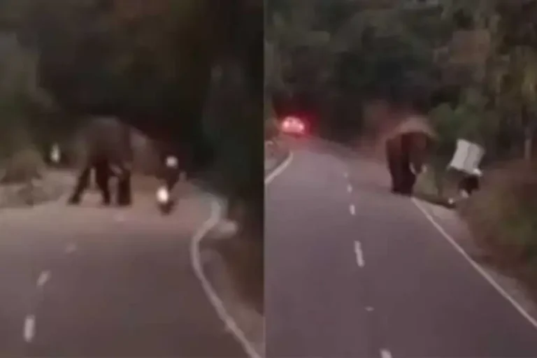ಬೈಕ್ ಸವಾರನನ್ನು ಬೈಕ್ ಸಮೇತ ಎತ್ತೆಸೆದ ಒಂಟಿಸಲಗ | ವಿಡಿಯೋ ವೈರಲ್
